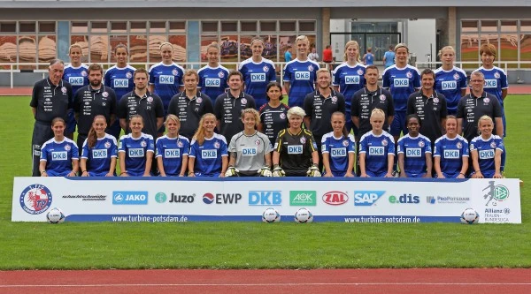 (back row L-R) Jennifer Cramer, Natasa Andonova, Pauline Bremer, Felicitas Rauch, Inka Wesely, Johanna Elsig, Stefanie Draws, Jennifer Zietz, Tabea Kemme, Asano Nagasato, (2nd row L-R) head coach Bernd Schroeder, goalkeeper coach Sebastian Rauch, physiotherapist Thomas Schultz, physiotherapist Christoph Biebermann, physiotherapist Christian Streckenbach, team managerin Aferdita Podvorica, athletic coach Timo Kirchenberger, athletic coach Erik Helm, assistant coach Achim Feifel, assistant coach Dirk Heinrichs, (first row L-R) Wibke Meister, Isabella Moeller, Lidija Kulis, Ingrid Wells, Jenny Hipp, Anna Felicitas Sarholz, Vanessa Fischer, Lia Waelti, Victoria Krug, Genoveva Anonma, Lisa Evans and Julia Simic